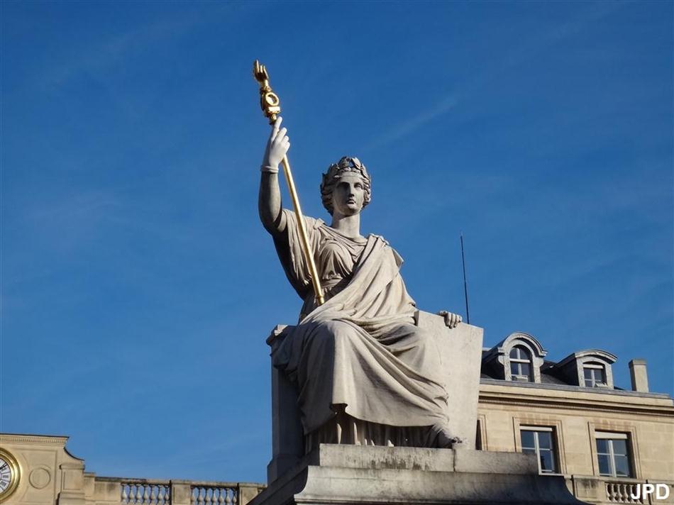 La Loi, statue en marbre de Jean-Jacques Feuchère, semble garder l'entrée de l'Assemblée Nationale.